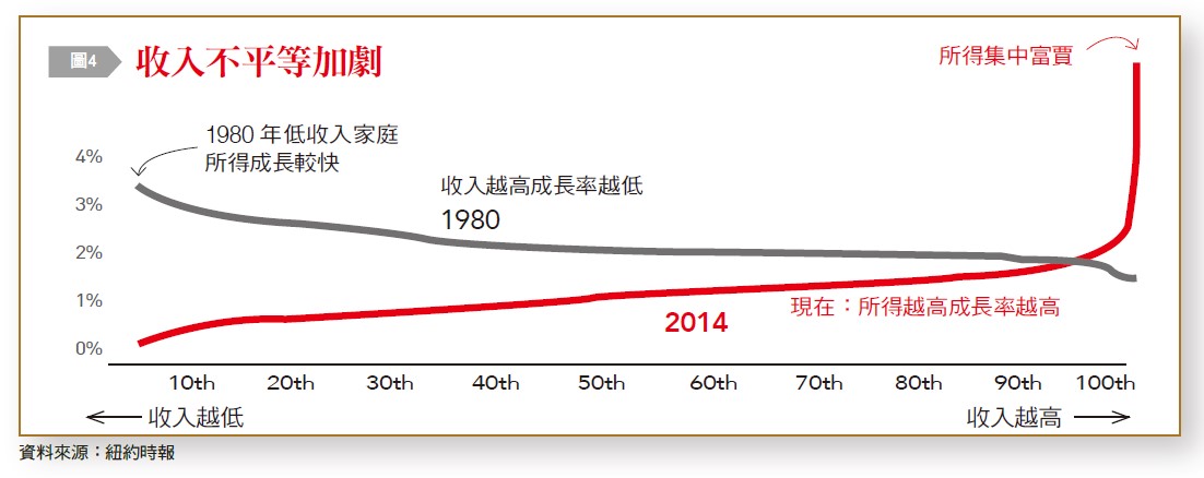 QE肆虐的大環境下,由於全球實體經濟成長仍顯疲弱,大量流動性進不了實體企業,最終多流入股、債、樓等資產市場。而我們知道一般民眾的收入與實體經濟表現息息相關,富人的財富則與資產價格關係相對密切。因此當金融資產價格的上升與實體經濟指標背道而馳,甚至此長彼消,將直接導致貧富差距惡化。普遍發生在各國的「1%vs.99%」的社會抗爭或「占領華爾街」運動,即是此一結構性問題的投射〔圖4〕。