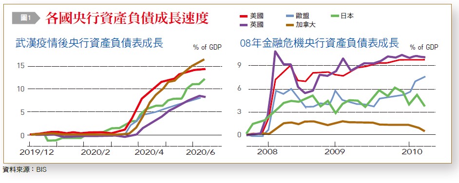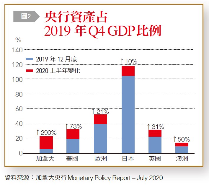 武漢疫情發生後,各國央行借鑑08年金融危機的經驗,量化寬鬆的力道可以說是「核彈級」。如〔圖1和2〕所示,在啟動QE後,央行資產規模的增加,以接近幾何級數的速度拉高。以絕對金額而言,雖然還是以美國最高,但以加速度來看,卻是加拿大獨占鼇頭,在短短幾個月內,央行資產竟從僅0.12兆加幣,快速膨脹290%,達GDP的15%以上。相較08年金融危機大約2年方完成整個過程,且膨脹規模遠遠小了許多,本次貨幣洪流的威力可見一斑。