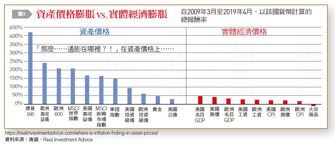 自2009年以來的10年間,諸如全球股票和債券之類的金融資產以遠高於全球實體經濟價格的速度攀升,例如〔圖3〕中,10年間標普500指數上漲了超過400%,對照勞動薪資與消費者物價指數(CPI)成長的牛步化,真的是天差地別。有學者批評就是因為用CPI衡量通膨,只考慮房租、食品、能源等商品物價,卻沒考慮到資產價格,造成CPI指標跟民眾真實消費力出現落差。