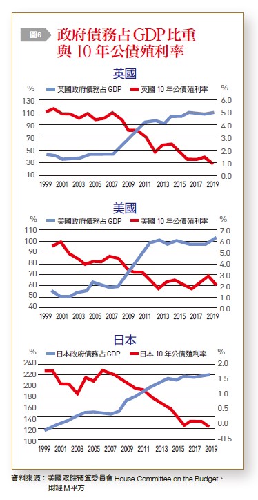 在美國眾院預算委員會2020年1月的第116次聽證會中說明:雖然經濟教科書上說,持續的預算赤字和不斷增加的政府債務將提高利率,加劇通貨膨脹並排擠私部門投資。或者說,債務高漲可能使投資者的信心下跌,引發災難性的財政危機,並加大了政府債務違約的風險。但自1980年以來,聯邦債務占GDP比率增加了兩倍多,但美國即使債務飆升至接近紀錄高點,利率和通貨膨脹率卻不升反降。英國、日本亦出現同樣現象〔圖6〕。債務上升,但以前認為的預期負面影響竟似乎未見,這種違反傳統貨幣理論觀點的現象,促使經濟學家重新評估政府債務的後果是否被高估。同時,原本被視為「偏激」甚至「異端」的現代貨幣理論(MMT),討論熱度急遽升高。(本文作者為台灣金融研訓院傳播出版中心所長)