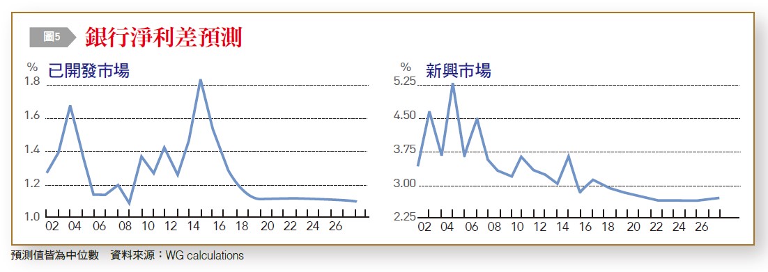 國際清算銀行(BIS)研究指出,貨幣寬鬆環境造成的長期低利率,可能會延續到2027年。淨利差(NIM)的持續低迷,將壓縮銀行傳統存貸業務的獲利空間,並削弱銀行面對金融風險的抵抗力。BIS建議銀行應有新的經營思維,進行獲利模式的轉型,例如強化風險管理能力,以多承擔風險從事新興事業的放貸,提升利差回報,或業務多元化增加非利息收入,以及利用科技降低營運成本等等〔圖5〕。