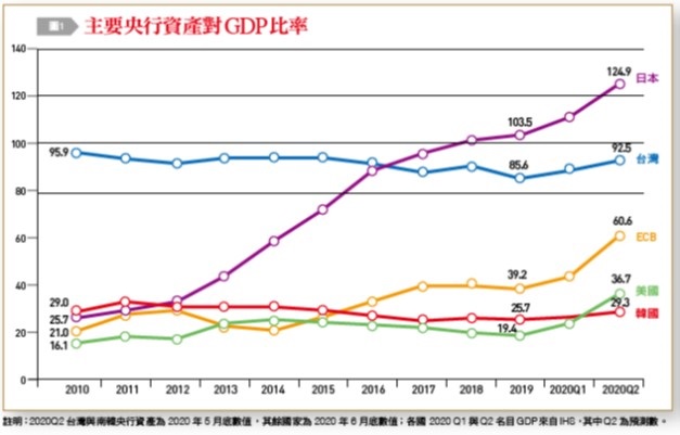 當面臨危機時,傳統上,央行的最後貸款者角色,已使央行具舉足輕重的核心地位。全球金融危機後,尤其是近期COVID-19危機期間,央行角色持續擴張;主要央行擴大資產購買計畫、甚或採廣泛的信用政策,彼等所採措施的規模、範圍與速度,已超越全球金融危機期間,且央行資產規模亦創歷史新高。截至本(2020)年4月底,Fed與BoE的資產規模已較2007年1月擴張約7倍;至於ECB與BoJ的資產規模,也大約成長4倍至5倍。〔圖1〕顯示,截至本年第2季,主要央行資產對GDP比率已大幅攀升,尤其BoJ更已攀抵124.9%。