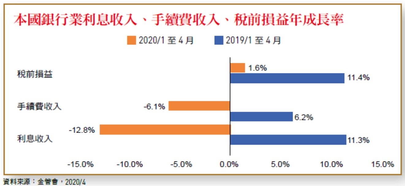 在疫情影響之下,今年前4個月本國銀行的利息收入出現負成長,手續費收入的增長也相對疲弱,使得獲利成長受到拖累。根據金管會統計,2020年1至4月本國銀行的利息收入較2019年同期減少6.1%,手續費收入則僅年成長1.6%,使得稅前損益較一年前衰減12.8%。與2019年前4個月利息收入、手續費收入、稅前損益皆較前一年同期正成長相比,疫情確實令本國銀行業的營運面臨不小考驗。