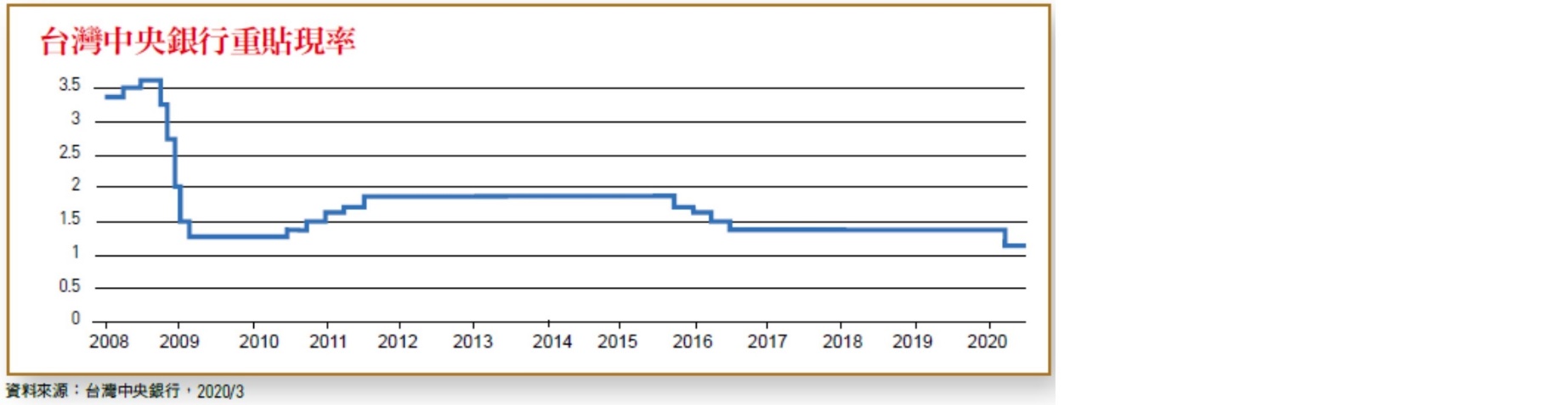 台灣屬於小型開放經濟體,國內環境難以不受國際變化影響。從疫情爆發以來,政府對疫情的管控相當成功,但大多數產業仍受不小衝擊。對於今年國內的經濟成長,各主要機構紛紛下修預期數據。台灣經濟研究院將預估經濟成長率由2.67%調降至1.58%,行政院主計總處由2.37%下修至1.67%,中央銀行由1.92%降至1.52%。同時,在3月各國央行大力降息之際,本國央行也將重貼現率由1.375%調降一碼至1.125%的歷史新低,使過去10年基準利率不到2%的低利環境必須延續。
