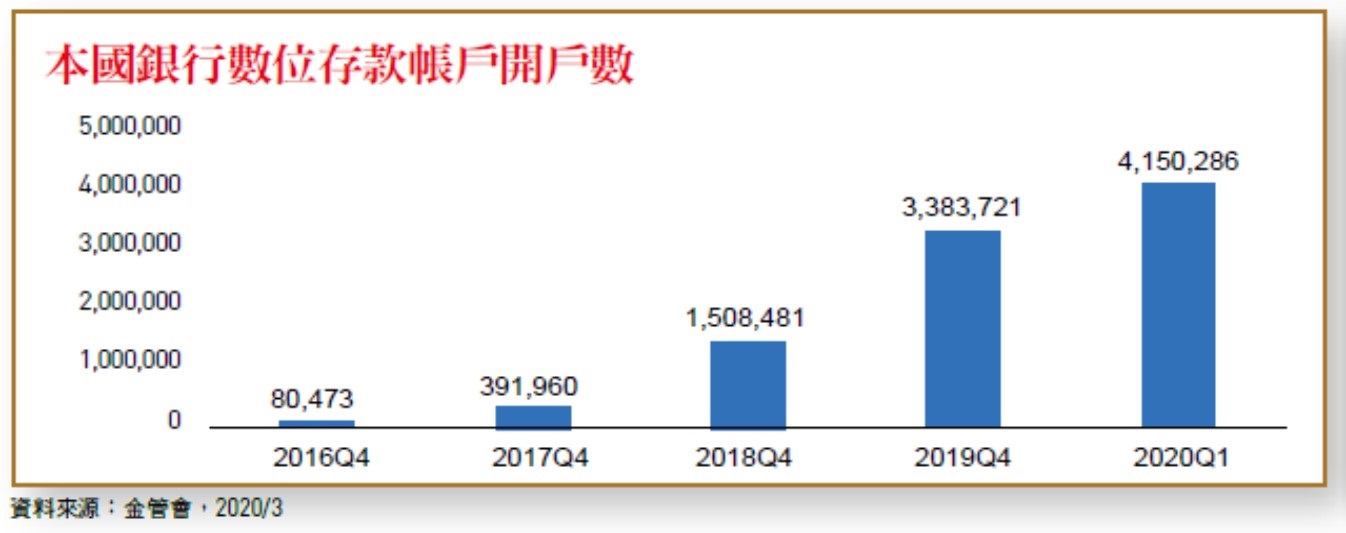今年5月底金管會黃天牧主委於上任後提出四大金融目標,其中推動金融創新和落實普惠金融兩項與數位金融息息相關,可見金融結合科技已是金融產業發展政策的重要主軸之一。以目前發展來看,數位銀行服務及行動支付相關業務已逐漸有所成效。依據金管會統計,截至2020年第1季,銀行數位存款帳戶的開戶數已達415萬戶,較2019年底大幅成長22.65%,顯示民眾對接受銀行數位服務的意願更高,而疫情也帶來一定發展助力。