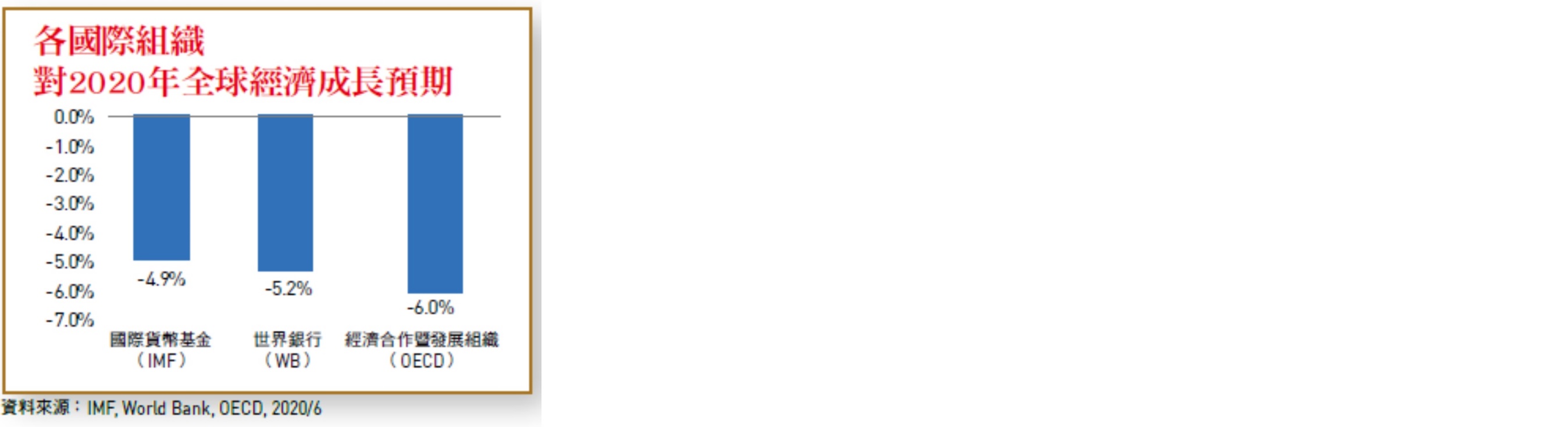 根據國際貨幣基金(IMF)6月公布的世界經濟展望更新報告,預估2020年全球經濟將負成長4.9%,較4月時衰退3%的預期更進一步下修。在IMF更新預測前,世界銀行(World Bank)及經濟合作暨發展組織(OECD)已相繼公布最新經濟預期,世界銀行預估今年全球經濟或將衰退5.2%,OECD認為衰退幅度可能達6%,若有第二波疫情則衰退或將加深至7.6%。由此可見,肺炎疫情帶來的衝擊明顯較先前預期嚴重。