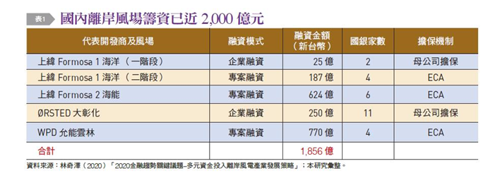 近兩年最吸引金融市場目光的,莫過於已有數座遴選風場分別與聯貸銀行團完成融資協議(Financial Close),對外宣告資金到位,這也象徵著國內綠色金融發展的一個重要里程碑。畢竟在此之前,鑑於缺乏如保證機制等配套分攤風險,從業人員也難以精確辨識與有效管控風險,遂鮮少國銀業者願投入離岸風電領域。