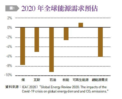依據國際能源總署(International Energy Agency, IEA)4月所發布的「2020全球能源回顧」(Global Energy Review 2020),受新冠肺炎疫情影響,今年首季與2019年同期相較,全球能源需求下滑3.8%,但再生能源卻增加1.5%。即便將時間拉長到2020全年預估,能源需求仍將縮水6%,降幅甚至是2008年金融海嘯期間的7倍,石油、天然氣、燃煤甚至核能無一幸免。唯獨再生能源一枝獨秀逆勢上揚,在疫情肆虐之際展現其與眾不同的強勁韌性,可望是2020年唯一還能夠繼續成長的能源,對於疫後景氣復甦將扮演關鍵角色。
