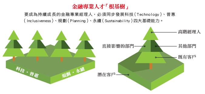 掌握人才就是金融業未來的決勝關鍵,台灣金融研訓院特別設計不同的策略和訓練內容,強化金融產業參與者的專業能力,對應四項未來趨勢提出四面向專業能力目標,分別是科技(Technology)、普惠(Inclusiveness)、規劃(Planning)、永續(Sustainability),稱為金融專業人才根基樹,專業人才須擁有這四項能力,為未來的挑戰和機會做好準備,才能在低利世代抓住機會並使金融業永續成長。