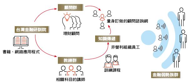 另外為了推廣普惠金融,台灣金融研訓院整理金融知識將內容整理成書籍,或設置全民金融網站、App等,並設計多階層教育建立新型態的知識傳遞模式。台灣金融研訓院可說建立了一個平台,找來理財規劃顧問團隊,並培育教師群教練團,這群教練團訓練非營利組織的社工建立財務管理技能。讓社工先成為第一線教育者進入偏鄉,針對財務弱勢族群強化其金融知識與常識。當社工遇到問題及困難時,還可與理財顧問進行線上提問及討論。