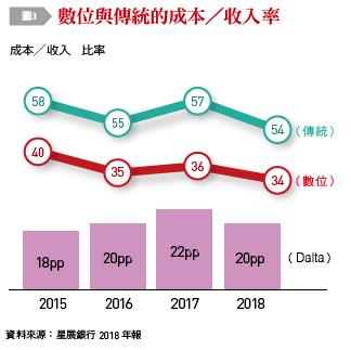 星展銀行在數位轉型歷程方向上是正確的,從國際獎項的多次肯定,也能證明我們某些部份的成功,而數位化帶給銀行的貢獻,可以從營收、成本、客戶滿意度等資料,看出與傳統流程間的差異。根據星展集團2018年的年報,加總兩大主力市場新加坡和香港,兩項最需要數位化服務的消費金融和中小企金業務,客戶數在2018年達290萬,從數位管道開戶的人數一年內增加40萬名,數位客戶占比從2015年的33%,到2018年已成長到48%,數位部門的成本/收入率為34%,也顯著低於傳統部門的54%〔見圖3〕。