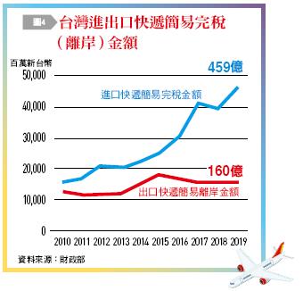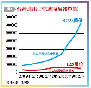相對的,我國進口跨境電商規模則出現爆發性成長。觀察我國進口快遞簡易報單數量,由2010年的971萬,快速成長至2019年達6,223萬份,9年間成長540%,遠高於同期間出口快遞簡易報單數量66%的成長率。而我國進口快遞簡易完稅金額,亦由2010年的159億元新台幣成長至2019年459億元新台幣,成長幅度達184%。