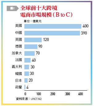 即便如此,各國跨境電商的發展程度仍存在巨大差異。根據聯合國貿易和發展會議(UNCTAD)資料〔詳圖2〕,全球前十大B to C跨境電商市場,仍以已開發國家為主,特別是在網路滲透率高、線上消費族群龐大,以及在國際間具備高度商品力的國家排名居前。例如遙遙領先的美國和中國大陸跨境電商市場規模皆已高達約400億美元,其次為英國、德國、加拿大、法國、義大利及荷蘭等歐美國家。亞洲國家中,除中國大陸外,僅韓國和日本分占8、9名。