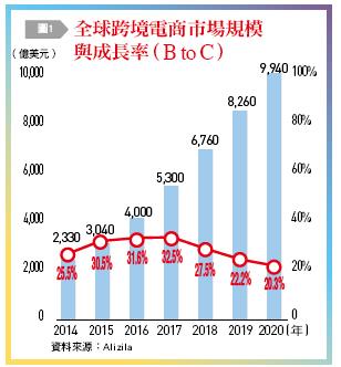 近年因應貿易戰與武漢肺炎疫情衝擊帶來的經貿新局與消費典範轉移,線上消費與網購滲透率提高,更成為不可逆之大趨勢。跨境貿易在全球電子商務占比為20%,全球跨境電商年複合成長率(CAGR)已達29%,成長幅度為非跨境電商的2倍,英國、德國、北歐、中國等地跨境網購都是消費常態,而跨境電商出口供應鏈、價值鏈(物流、金流、資訊流)發展亦逐步完善,浮現龐大商機。