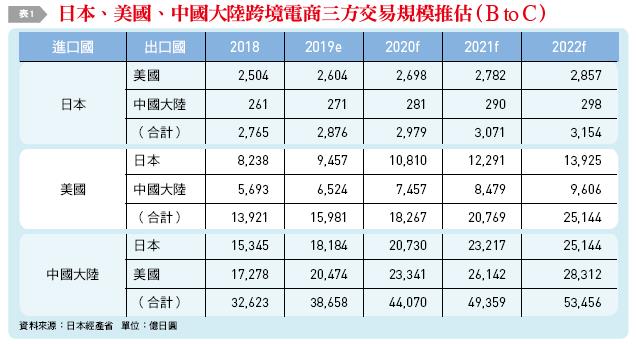 根據日本經產省統計資料〔詳表1〕,2019年中國大陸跨境電商自美國及日本進口商品之規模最大,高達20,474億日圓及18,184億日圓,年成長率皆達18.5%,且遠高於中國大陸出口至美國及日本之規模。顯示中國大陸雖為全球跨境電商之主要輸出國,但自身進口需求旺盛,且消費者習慣於電商消費模式,是我國布局亞洲跨境電商的重點潛在市場。