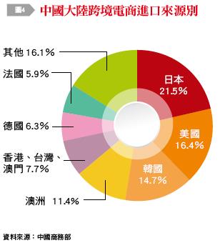 在進口跨境電商方面,主力由網易考拉海購、天貓國際、京東全球購、唯品會、小紅書、洋碼頭等業者領頭,並早已組成海外採購團隊,將全球優質商品引入中國大陸國內電商平台。其中商品的進口來源以日本居首,占其進口跨境電商總額的21.5%,其次是美國16.4%、韓國14.7%及澳洲11.4%。而台灣與香港、澳門合計,僅占約7.7%,與我國傳統貿易上對中國大陸具有貿易優勢之情況形成落差,顯示我國跨境電商仍有極大成長空間。