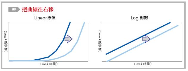數學的對數圖可以清楚顯示這種策略的原理〔見圖1〕。X軸是時間,圖1右圖的Y軸是感染者的對數。碰到像疫情這種指數成長的函數,對數圖相當好用,在圖中如果看到朝向右上的直線,就表示增長率穩定不變。對數圖也顯示,直接減少感染人數,與將整條線往右移的結果是一樣的。所有防疫成功的亞洲國家一開始都立刻採取防堵策略,爭取了更多的時間;但這種作法本身只是拖字訣,它們後來之所以成功,是因為以這段時間打造了其他防禦機制。