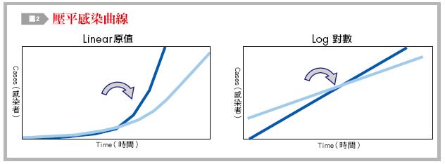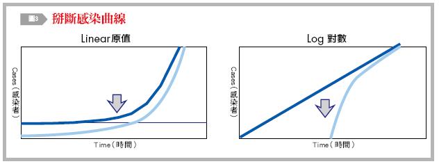 它最終的目標是降低感染者數量,力求完全消失。只要將感染控制在特定範圍,感染數就不會繼續指數上升,這一期的病例量將不再決定下一期的新病例量。數量與時間之間的關係一旦改變,對數圖立刻一覽無遺〔見圖3〕。