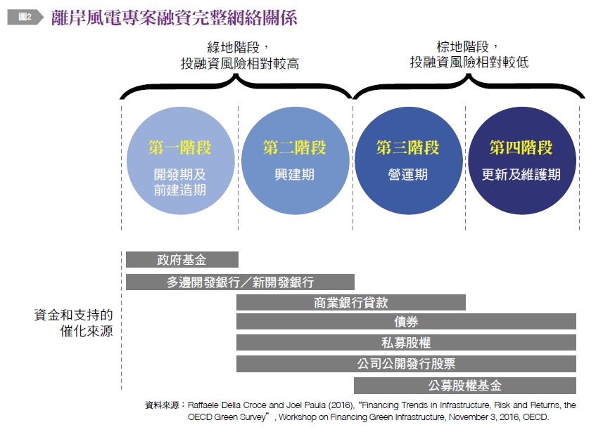 離岸風電專案第二個成功關鍵因素,即為多元籌資管道〔如圖2〕。根據2016年經濟合作暨發展組織(OECD)「基礎建設的融資趨勢、風險、報酬及OECD的綠色調查」研討會指出,基礎建設的生命循環,皆存在不同階段的資金需求與籌資管道;第一階段開發期及前建造期,需要政府基金及MDBs(多邊開發銀行)/NDBs(新開發銀行);第二階段興建期,需要MDBs(多邊開發銀行)/NDBs(新開發銀行)、商業銀行貸款、債券、私募股權、公司公開發行股票;第三階段營運期,則需要商業銀行貸款、債券、私募股權、公司公開發行股票及公募股權基金;第四階段更新及維護期,則有債券、私募股權、公司公開發行股票及公募股權基金。