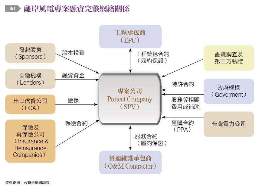 發展離岸風電專案的關鍵成功因素,即為建構離岸風電專案具有強化專案信用的專案融資完整網絡關係〔如圖1〕,及提供具有初級市場與次級市場的多元籌資管道;首先是建構專案融資完整網絡關係,離岸風電專案融資為無追索權融資方式,唯一的還款來源,是從離岸風電專案開始營運後產生現金流量而來,以支付金融機構的長期貸款本息;因此,第一個成功關鍵因素為建構離岸風電完整專案融資網絡關係,藉以強化專案信用,內涵即為需要充份的銀行參貸、ECA(出口信用機構)擔保、保險合約、履約保證及明確的PPA(Power Purchase Agreement,再生能源購電協議)合約等缺一不可的元素。
