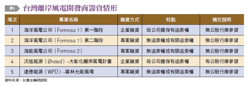 我國代表性離岸風電專案之籌融資模式,至2019年底分別有上緯海洋風電「FormosaI」第一階段企業融資與第二階段專案融資、海能風電公司(Formosa2)專案融資、沃旭能源(Ørsted)「大彰化離岸風電計畫」企業融資及達德能源(WPD)「雲林允能風場」專案融資,共5個案場。觀察目前案例,問題點顯現在具有豐富經驗的外商銀行與本土民營銀行較明顯積極投入參與,而公股行庫則顯為保守,僅參與沃旭能源「大彰化離岸風電計畫」的企業融資聯貸案,而達德能源(WPD)「雲林允能風場」的專案融資則未見公股行庫參與。因此為了協助產業及我國離岸風電專案籌資成功,值得分析與研商對策〔詳見表3〕。