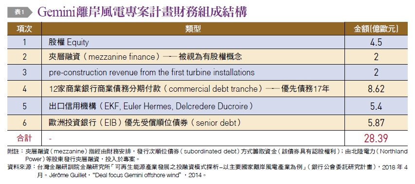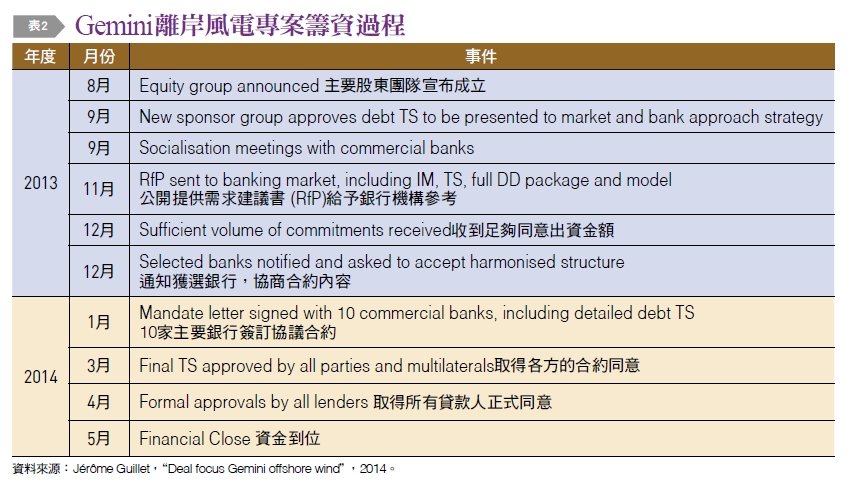 Gemini離岸風電總專案規模28.39億歐元,是當時歐洲單一最大規模的離岸風電專案,在2014年該計畫取得專案的全部資金到位,債權與股權比例為7比3;7成資金,約19.89億歐元資金以專案融資銀行聯貸方式來承作,包括三家出口信用機構(EKF、Euler Hermes及Delcredere Ducroire)提供信用保證機制;參與聯貸的12家銀行,分別為ABN AMRO Bank、Bank of Montreal、BNG、BNP Paribas、BTMU、Caixa Bank、CIBC、Deutsche Bank、EDC、Natixis、Santander及SMBC。Gemini離岸風電專案從籌資期間僅10個月即順利完成資金到位,財務組成結構及籌資過程,說明如〔表1〕及〔表2〕。