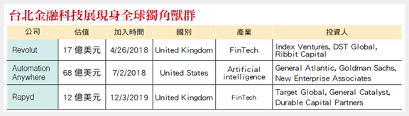 FinTech Taipei 2019台北金融科技展邀請到5家獨角獸:其中Revolut、Rapyd、Automation Anywhere在截至2019年12月的「全球獨角獸俱樂部」(The Global Unicorn Club)名單之中,估值分別是17億美元、12億美元、68億美元;財富管理平台FNZ則是在2018年因私募基金注資時,估值宣稱達16.5億英鎊,換算美元約21.35億元;Kiva則因屬於類社會企業,小額借貸給全球各地有需要的小農或弱勢族群,可定位為「FinTech for Good」,全球群募平台crunchbase的資料,目前累計向全球募資900萬美元。
