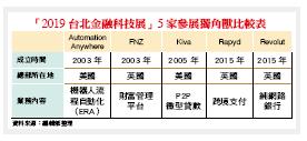 今年的台北金融科技展,主辦單位邀請美國與英國共5家金融科技獨角獸來台,包括Automation Anywhere、FNZ、Kiva、Rapyd及Revolut,與台灣金融、新創產業作深度交流,將國際獨角獸成長經驗及思維帶入台灣金融創新生態。其中,Automation Anywhere是目前討論度最夯的獨角獸新秀之一,主要發展機器人流程自動化技術(RPA),並利用AI軟體機器人(software robots)協助金融業進行流程改造,將原本的人工作業流程自動化,再應用AI不斷學習成長,提升作業的效率與彈性。