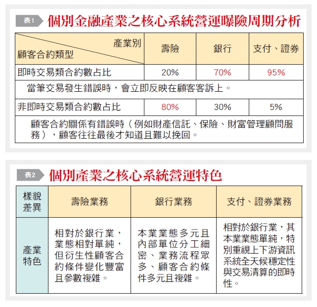 從[表1]可清楚體會到:「壽險業者」隨著其「非即時交易類」合約「占比越高」,其「系統轉換風險」將變得難以「立即顯露」。原因就在於:顧客從「簽約到理賠完畢」過程中,所花費的周期時間較長(最長可達數十年之久),因此顧客往往「難以提早知道」有系統性錯誤,更難以立即反映或客訴。