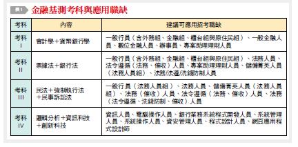 「金融基測」是金融研訓院彙整近3年八大公股銀行對於無經驗的新進行員或資訊人員之熱門考科,並邀集各銀行業者及專家學者共同研擬,將較常出現之考試科目進行整合並擬定如〔表1〕,期藉此考試供多元管道招募之銀行業者多一項鑑別工具。