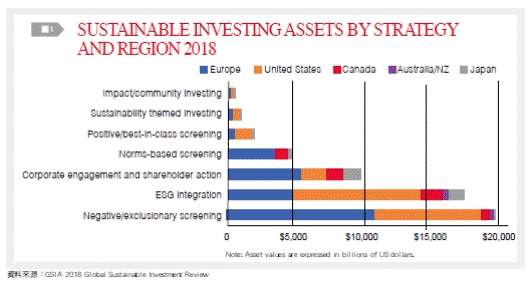 各投資機構的責任投資作法不盡相同,全球永續投資聯盟(GSIA)將責任投資分類為7種作法,其中「負面/排除性選股」(Negative/exclusionary screening)是最常被使用的責任投資作法,也就是根據特定的ESG標準將某些企業或產業(如:爭議性武器產業)列入不投資名單中,而2018年全球投資機構所管理資產中有高達19.8兆美元採取負面/排除性選股。其次是「ESG整合投資」(Integration of ESG factors),係指投資機構在投資分析過程中,除了分析投資對象的財務績效表現及未來成長性等項目外,也會分析企業如何管理ESG風險及機會;ESG整合投資在全球的投資金額則高達17.5兆美元。