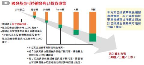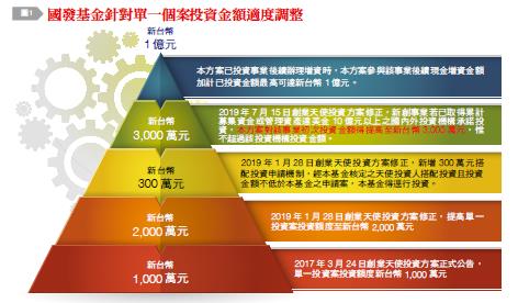 然而,後續仍有新創業者反映,國發基金提供新創企業在種子輪或天使輪的資金挹注,但若之後新創企業仍有資金需求,根據現行規定,國發基金只能投資一次,無法再對新創企業的後續增資提供任何協助。另外,新創企業若要擴展海外市場,相關專利申請、海外分支據點的成立以及市場行銷費用相當驚人,國發基金現行最高投資金額2,000萬可能不夠支應這些費用。國發基金因此在今年7月15日再度修正放寬相關規定,針對已投資的新創企業,後續辦理增資時,國發基金得持續參與投資,累計投資金額最高並可達1億元新台幣,希望藉此讓台灣優良新創事業能有機會成為獨角獸,不會因為資金問題而受困。此外,新創事業若獲得國內外大型創投(意指管理資產達10億美元以上)機構承諾投資3,000萬元新台幣,國發基金初次投資金額也可增加至3,000萬元,以協助新創事業進軍國際盃。