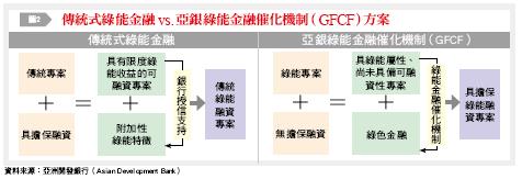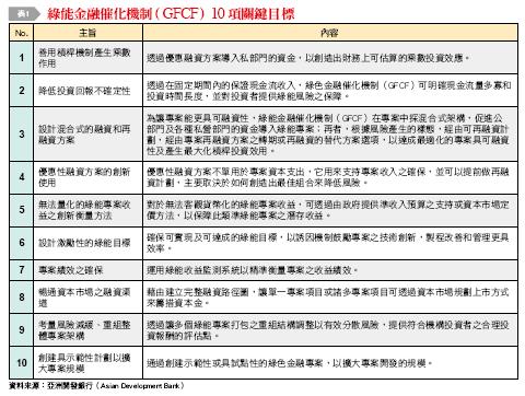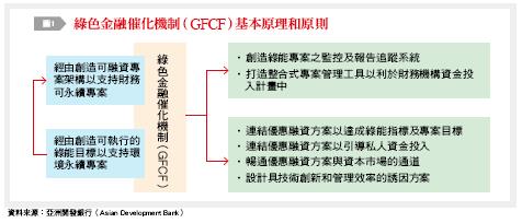 近年來,亞洲開發銀行積極倡議綠能金融催化機制(GFCF),協助亞洲各國拓展綠能專案多元融資工具,及履行綠能金融機制帶頭起典範作用,期盼更有效地匯集私人資金以導入綠能基礎設施投資,讓綠色金融邁向全新局面。