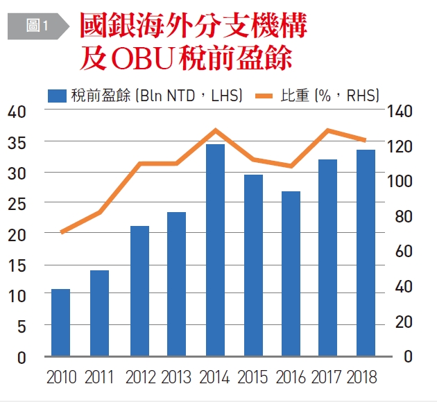 就具體數據觀察,國銀海外分支機構及OBU稅前盈餘,從2010年新台幣370億元,一路上升到2018年1,170億元,占總盈餘比重也從2010年20.2%,上升到2018年35.01%,中間雖有轉折,但大體呈現上升趨勢,〔詳如圖1〕。其中,幾家獲利排行前段的大型銀行,海外獲利成果豐碩,中信銀2018年海外獲利(不包含OBU)高達126億元,占年度全行獲利的35%;玉山銀行2018年包含OBU在內的海外獲利占全行獲利比重更超過45%;官股的兆豐銀行每年海外獲利占比都高達全行的5成以上,僅2019年上半年受到紐約分行洗錢防制成本上揚影響,而下滑到45%,但今年也將努力朝55%的目標邁進。
