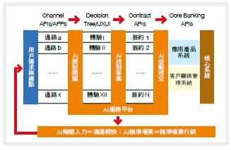 傳統生產者導向的公版金融商品越來越不討喜,客戶對客製化金融需求隨行動銀行App的導入後益顯可行與精緻,於是催生出「最小可實現化的AI服務」(Minimum Viable AI Service),一方面透過AI服務大量串聯「可及通路、最佳體驗、快速簽約」三者價值以達成「往來自動化、操作便利化、包裝貼心化」三效,並誘發「精實(Lean)、敏捷(Agile)與營運開發一體化(DevOps)」等各類未來金融服務創新運作必經之變革道路,簡單說「做事情的方法要徹底改變了」。
