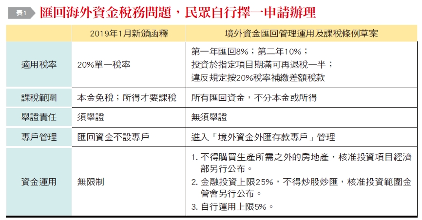 面對國際局勢如此空前變化,政府相關部門從去年就開始研議「歡迎台商回台投資行動方案」,內容包括引進的投資項目、客製化單一窗口、土地、水電與人力協助,並從今年1月1日開始實施。至於推動投資的資金動能方面,財政部於今年1月新頒函釋,若能證明匯回資金是本金,則不課稅。其他則視為海外所得,課以20%的單一稅率。然而由於年代久遠,舉證困難,再加上政府希望能更積極的引導資金回台投資重點項目,例如智慧機械、亞洲矽谷、綠能科技、生醫、國防、新農業與循環經濟等5+2產業,因此行政院院會在今年4月通過「境外資金匯回管理運用及課稅條例草案」(以下稱本條例),並列最優先法案。