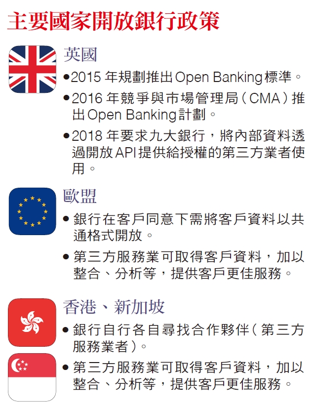 除了歐盟之外,英國CMA也推出開放銀行計劃,並在2018年要求英國境內的九大銀行,將內部資料透過開放API提供給授權的第三方業者使用。比較起來,香港與新加坡政府則採行另一種做法,即不頒布強制性法令,而是訂定一個合作框架,銀行可自行尋找第三方合作夥伴,取得客戶資料加以分析、整合,以提供客戶更佳的服務體驗。