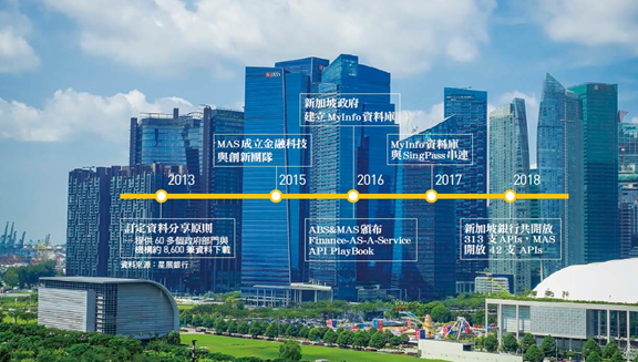 新加坡金融管理局(MAS)於2015年成立金融科技與創新團隊,除了連結銀行與金融科技新創產業外,也對數位銀行、開放銀行等議題進行政策制定與協助。相較於歐盟的強制性措施,新加坡金融監理機構採取建置政策架構以及鼓勵的性質推動。因此MAS與新加坡銀行公會(ABS)於2016年頒布Finance-As-AService API PlayBook,詳細制定金融業API發展策略,並鼓勵銀行參與開放API。截至2018年底,MAS開放42支API供查詢金融業公開資訊,並督導新加坡的銀行,包含星展、華僑、花旗、渣打銀行等,共開放313支API。