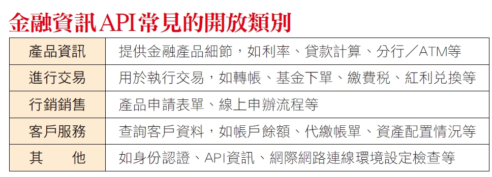銀行透過與第三方平台合作,運用API達到數據共享、資訊交互利用的目的,除了提供更佳的客戶體驗,對金融業乃至整體產業發展都有相當的助益。有鑑於此,星展集團於2017年推出全球最大的銀行API開發平台「DBSDevelopers」,上架150多支API,提供資金轉帳、卡友紅利、手機支付、連結星展支付工具PayLah!等服務。企業客戶可使用銀行API,即時支付其零售客戶;證券公司可即時於銀行和證券帳戶間轉帳;保險公司亦可向客戶提供即時保險費賠償,並直接支付至其銀行帳戶,取代傳統流程做法,滿足數位世代行動效率的需求。