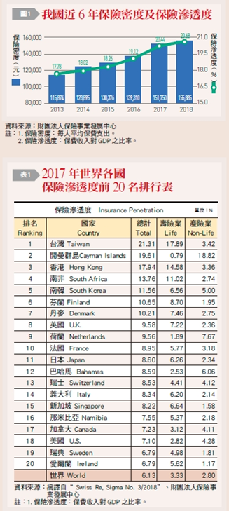國人在理財投資時,通常首選保本型保險產品,據保發中心今年3月最新公布統計,2018年保險密度,即國人平均每人保費支出(及保險密度)高達15萬5,885元,其中7,021元為產險保費支出,剩下14萬8,865元都是壽險保費支出,滲透率(保費占GDP的比重)已超過2成,創史上新高紀錄,尤其是國人平均1人有2.5張以上壽險保單,壽險滲透率甚至高居全球第一名。〔參見圖1及表1〕
