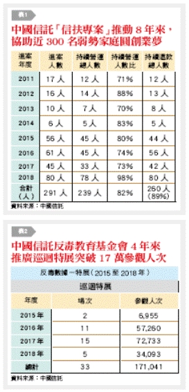 截至2018年12月底,中國信託信扶專案已協助291個弱勢家庭創業,當中含256個家庭正式申貸、35個家庭進入試營運輔導,申貸金額超過新台幣1.2億元,還款率近9成。預計於2021年扶助超過500個弱勢家庭創業圓夢、脫貧自立。專案創立迄今,目前仍有239位家長(82%)持續營業打拚,經輔導進行創業、轉就業的家長,其累計還款率高達89%。
