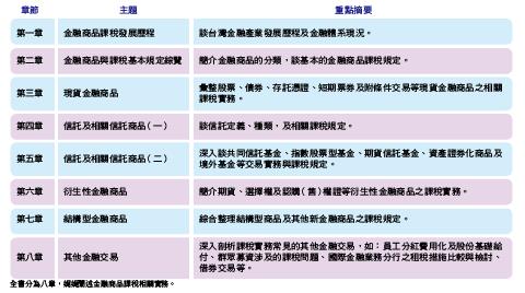 全書按商品種類編排,方便讀者實務上的檢索,各章分述金融商品課稅發展歷程、現貨金融商品、信託金融商品、衍生性金融商品、結構型金融商品,以及其他金融交易流程及課稅規範,內容範圍廣泛,實乃自我充實本質學能或是稅務參考書之不二選擇。書中沒有艱澀的稅務用語,也沒有繁瑣的計算,作者透過大量的圖表消化相關規定後,萃取最精華的心得摘要分享給讀者,對於新手入門者,可以得到最豐富的稅務知識養分注入,對於從事金融商品銷售者,稅務知識的加乘,將讓你如虎添翼,專業倍增。