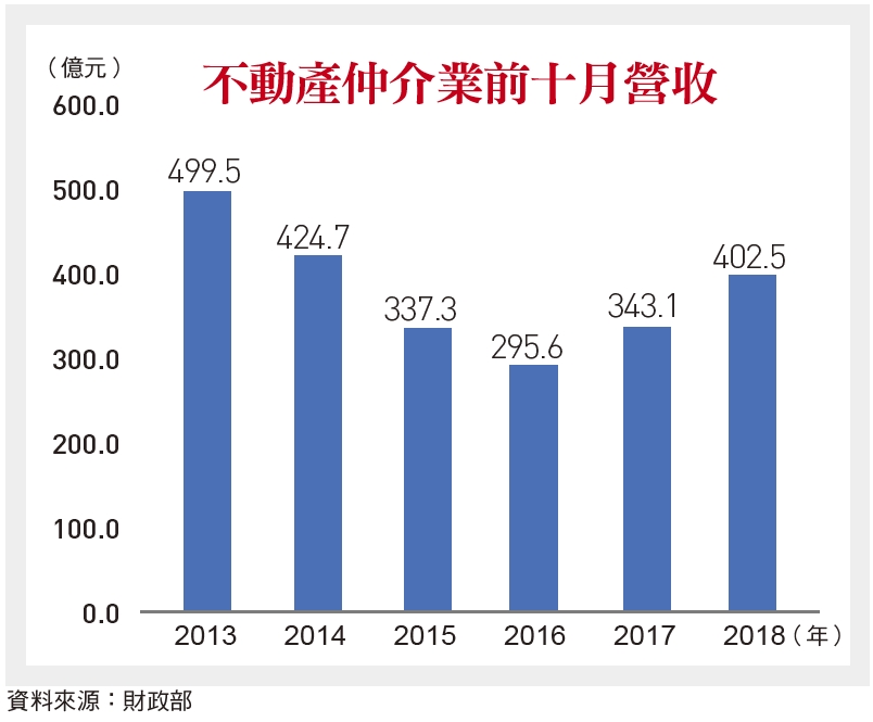 從交易量就可以觀察市場交易是否回溫,2018年全台的買賣移轉棟數大約落在28萬棟,是近3年以來的高點,另外對於房市景氣最敏感的指標,莫過於仲介業實際的業績表現,根據財政部2018年前10月的不動產仲介業營收來看,全台仲介業的營收(服務費收入)已經達400億元以上,年增17%且創下近4年以來的新高,交易量落底反彈跡象明顯。