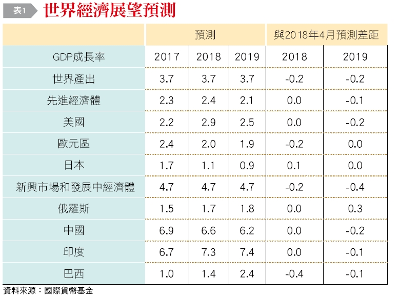 對於2019年投資展望,我們仍是不容樂觀!國際貨幣基金2018年10月最新發表的《世界經濟展望》再次下修2018年與2019年的全球經濟成長率0.2%〔見表1〕,美國採取的一連串貿易措施依舊是造成全球主要經濟體經濟成長放緩的主因。在此次《世界經濟展望》報告中,國際貨幣基金認為,基本面欠佳的新興市場和發展中經濟體受到的經濟衝擊更大,報告中更大幅下調2019年新興市場和發展中經濟體的經濟成長率高達0.4%。值得注意的是,2018年10月報告出爐時,國際油價正處在今年的高檔區,當時布蘭特原油的價格每桶還在80美元以上,許多能源出口國因為國際油價上漲受惠不少,之後國際油價便因為政治與供需因素大幅修正,筆者撰稿之時布蘭特原油已下跌至每桶56美元附近。油價的劇烈修正將使石油出口國的經濟成長嚴重受挫,可以預期的是2019年國際貨幣基金恐怕會繼續下修新興市場和發展中經濟體的經濟成長率,而且幅度不小!