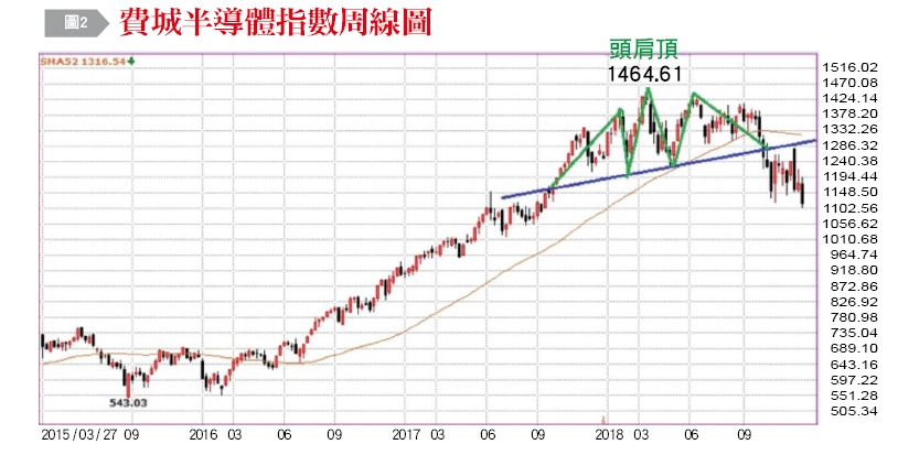 筆者2018年10月從長期觀察的長期技術面圖走勢中,發現美國費城半導體指數不但年線下彎(目前在1316點附近),而且形成技術面最強的空頭反轉型態「頭肩頂」,之後2個月費城半導體指數再下跌超過14%〔見圖2〕。從技術線圖的發展上可以預見,半導體或是科技產業將是這一波經濟表現疲弱下,遭受最大挑戰的產業,我們相信2019年第2季五窮六絕來臨時,不少知名的科技產業會繳出極為難看的經營數字!