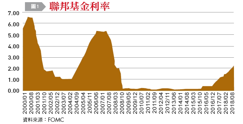 首先,就聯準會升息方面,美國聯邦公開市場委員會(FOMC)2018年12月19日無視美國總統川普嚴厲抨擊,依舊決議將聯邦基金利率目標區間調高一碼至2.25%至2.50%〔見圖1〕,這是聯準會2018年第4次升息,也是2015年底啟動升息循環以來第9次升息。聯準會主席鮑威爾(Jerome Powell)會後記者會並預告2019年升息預期從原本的3次下調至2次,市場期待的停止升息希望落空,因此當升息結果宣布之後,美國四大指數由紅翻黑重挫超過1.5%。