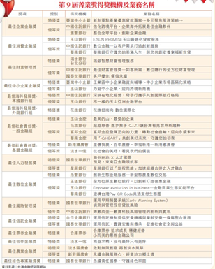 值得注意的是,早年大獎多由外商銀行囊括,近幾屆已逐漸成為泛公股銀行與民營銀行一較高下的局面;今年「菁業獎」進一步區隔不同類型的金融業,讓同一類型或特性的金融機構有機會站在同一個立足點上去彰顯優勢,與其他金融機構共同爭取獎項,例如信用合作社、農會等基層金融機構或外商銀行,在今年都有不錯表現。
