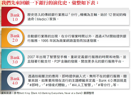 參考BrettKing針對傳統銀行的觀察歸納,Bank1.0可以理解為當今所有銀行的本質;然後如果只有網路銀行,但沒有開發專屬行動App的銀行,大概就落在Bank2.0的層次;現在大部分的銀行還沒完全開放手機直接開戶的服務,所以也還稱不上Bank3.0的層次,應該算是落在Bank2.5的層次;目前,稱得上是邁向Bank4.0的銀行,全世界大概也屈指可數!