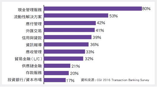企業金融的領域廣泛且遠比消費金融複雜,在資源有限之情形下,應如何決定數位應用之發展方向?2016年加拿大CGI集團曾進行一項超過300家的銀行與企業之大規模研究,調查企業最需要其主要銀行所提供的金融服務為何。如[圖2]所示,前5大依序為:現金管理服務、流動性解決、應付帳款管理、外匯交易及信用融通貸款。這些項目,目前銀行看來相對於非金融業者尚有利基,因此銀行要努力的方向,應在於利用科技強化資金結算與產品開發平台,為企業客戶提供包括收、付款、資金管理、資訊服務等在內的各種收支管理產品和服務,從而提高客戶應收與應付款統計與清算的效率,加快內部資金的調度與調整,獲取即時、準確現金流訊息。同時,銀行也可應用科技將企業的短期閒置資金自動投資短期生息資產,從而為客戶提供多樣化投資機會,以提高資金回報率。