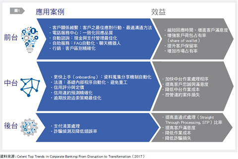 在企業金融領域,有幾項新興科技最為人關注:人工智慧(機器學習)、流程機器人(Robotic Process Automation, RPA)、生物辨識以及區塊鏈技術。首先,企業金融從過去敘述統計報表,進化至商業智慧診斷分析,現在更往鑑往知來的預測分析,以及自我進化的機器學習前進。[圖1]整理出機器學習在企業金融場域的主要應用: